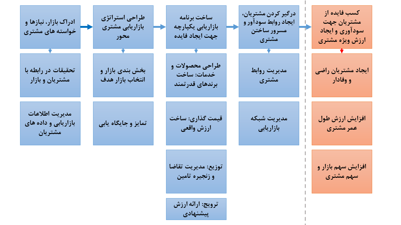 به طور خلاصه، چهار مرحله نخست فرآیند بازاریابی مشتمل بر اقدامات استراتژیک (ادراک بازار و تدوین استراتژی) و اقدامات تاکتیکی (آمیخته بازاریابی مناسب، درگیری با برند و برقراری رابطه با مشتریان) ایجاد و ارائه ارزش به مشتریان را نتیجه می دهد. سرانجام و در گام نهایی، شرکت با کسب ارزش از مشتریان، پاداش برقراری روابط قوی و پایدار با مشتریان خود را درو می کند. به بیان دقیق تر، ارائه ارزش برتر، کیفیت ادراک شده بالا و افزایش فایده موردانتظار، رضایت مشتری را به همراه داشته و موجبات خرید و خرید مجدد را فراهم می آورد. این مهم وفاداری مشتری را منتج شده و لذا ارزش طول عمر مشتری و درنهایت ارزش ویژه مشتری _ مجموع ارزش های ترکیبی طول عمر مشتری تمام مشتریان شرکت را گویند _ را افزایش داده و سودآوری مستمر شرکت را نتیجه می دهد.